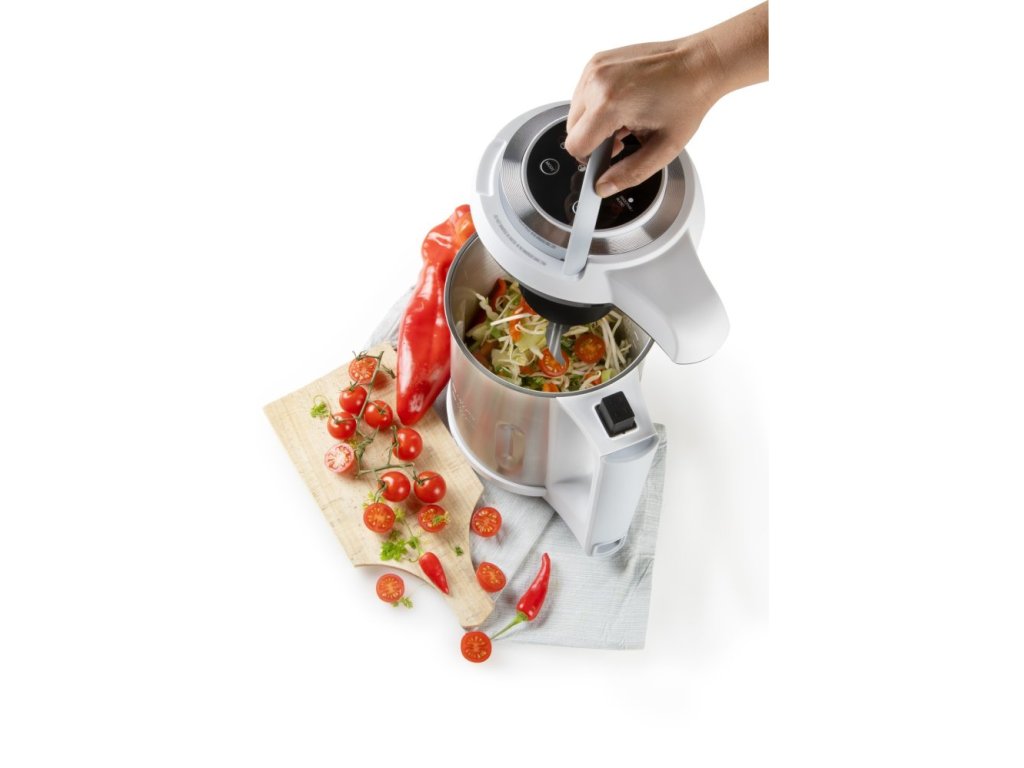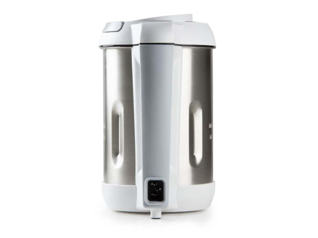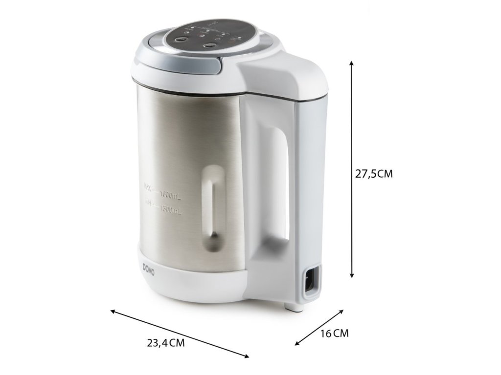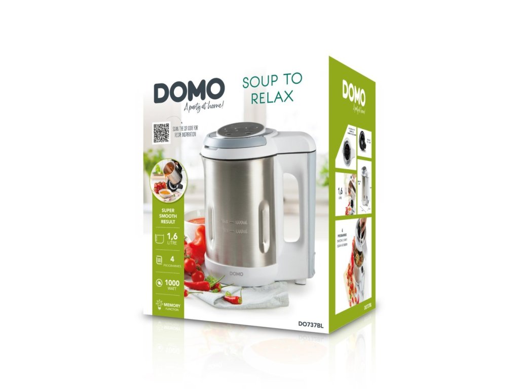 S automatickým polievkovarom sa stanete majstrom v príprave skvelých krémových polievok a ešte si ušetríte čas nielen pri varení, ale aj pri upratovaní po varení. Automatický polievkovar sám varí a priebežne obsah mixuje. Za cca 20 minút vám z vložených ingrediencií polievkovar vykúzli jemnú krémovú polievku a môžete servírovať. Vďaka nastaviteľným programom je možné aj polievky s kúskami surovín, ktoré sa nerozmixujú. Nevadí ani ak sa chvíľu oneskoríte. Polievkovar po dovarení ešte ďalších 30 minút udržuje hotovú polievku teplú a priebežne ju premiešava. Po varení potom môžete využiť funkciu čistenia, ktorá za vás efektívne vyčistí zvyšky polievky zvnútra nádoby. Jedná sa o rovnaký polievkovar ako bol predchádzajúci obľúbený model DOMO DO732BL. Líšia sa iba farbou. Základné parametre Typ prístroja: automatický polievkovar Objem: 1,6 l Minimálny objem: 1,3 l Materiál nádoby: nerez Príkon ohrevu: 1 000 W Príkon mixéra: 200 W Programy a funkcie varenia Program krémová polievka (21 min, varí/mixuje) Program varenia polievky bez mixovania (28 min, varí) Funkcia Keep Warm pre automatické udržiavanie teplej polievky 30 minút po dovarení (ohrieva a priebežne obsah premieša) Pamäťová funkcia pre dočasné prerušenie programu až na 2 minúty (napr. pre pridanie ingrediencií) Poistka proti spusteniu pri preplnení Zvukový signál konca programu Ostatné funkcie Funkcia čistenia (4 min priebežného mixovania a ohrievania vody) Funkcia pulzného mixovania (držaním tlačidla) Ovládanie LED displej zobrazujúci čas do konca programu a vybraný program, alebo funkciu Digitálne ovládanie pomocou tlačidiel na vrchu prístroja Ostatné užitočné vlastnosti Nerezový nôž s 2 čepeľami Vymeniteľné čepele Nádoba z kvalitného nerezu s vyznačením min a max objemu Výklopná rukoväť veka na bezpečné zdvihnutie a prenášanie veka (motorové časti) Ochrana kontaktov proti striekajúcej vode Veľká rukoväť pre jednoduchú manipuláciu Poistka proti spusteniu bez veka Hladké dno na jednoduché čistenie Moderný polievkovar ponúka ďalšie mnohostranné využitie Polievky Smoothie Milkshake Ovocné nebo zeleninové pyré (príkrmy) Kompóty Rozmery balenia a prístroje Rozmery balenia (š x h x v): 28,7 x 21 x 35,3 cm Hmotnosť balenia: 3,2 kg Rozmery prístroja (š x h x v): 23,6 x 16,3 x 28,2 cm Hmotnosť prístroja: 2,3 kg Dĺžka kábla: 110 cm Odnímateľný kábel Balenie obsahuje Telo polievkovara DO737BL Veko polievkovaru s mixérom Odnímateľný kábel Návod na použitie