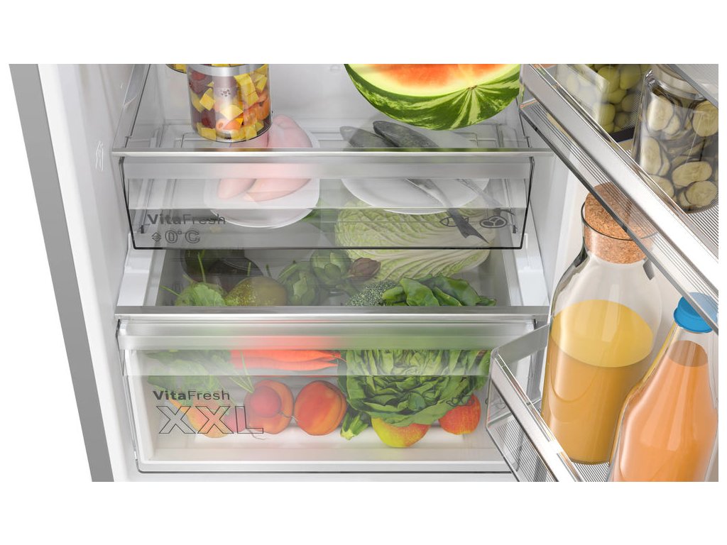 Moderná kombinovaná chladnička s mrazničkou dole s výškou 186 cm ponúka ideálne riešenie pre každodenné skladovanie potravín. Objem chladničky 218 l a mrazničky 103 l poskytuje dostatok priestoru pre rodinné nákupy. Ročná spotreba energie 127 kWh / 365 dní zabezpečuje úspornú prevádzku. Prehľadné LED elektronické ovládanie umožňuje jednoduché nastavenie teploty. Technológia No Frost eliminuje tvorbu námrazy a potrebu odmrazovania. Špeciálna zásuvka VitaFresh XXL <0 °C> udržiava optimálnu teplotu pre mäso a ryby. Povrch v prevedení matná oceľ AFP je odolný voči odtlačkom prstov. Funkcie automatické super mrazenie a super chladenie rýchlo stabilizujú teplotu po vložení potravín. Praktické externé madlo a Bottle Rack zvyšujú komfort používania. Tichá prevádzka s hlučnosťou iba 33 dB zabezpečuje maximálny komfort.
