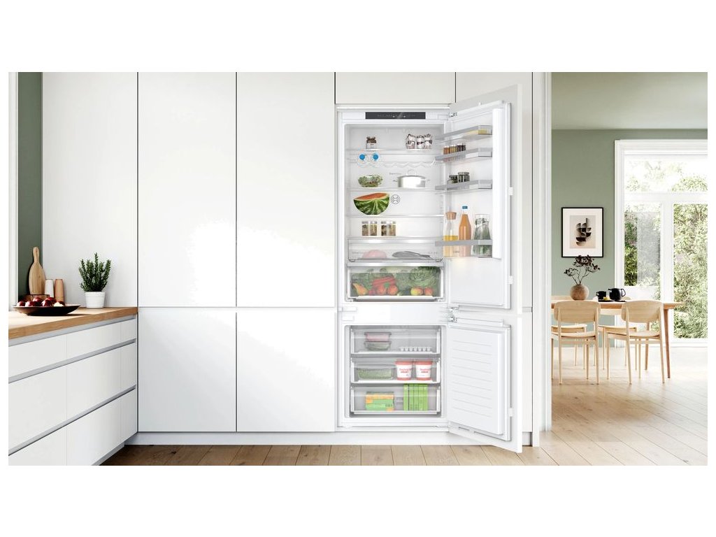 Špeciálna zásuvka VitaFresh XXL <0 °C> vytvára ideálne podmienky pre skladovanie mäsa, rýb, ovocia a zeleniny, ktoré si zachovajú čerstvosť po dlhší čas. Praktický držiak na fľaše (Bottle Rack) zvyšuje prehľadnosť vnútorného priestoru. O rovnomerné osvetlenie sa stará bočné LED osvetlenie (2×). Funkcie Super mrazenie a Super chladenie umožňujú rýchle spracovanie nových potravín bez kolísania teploty. Mimoriadne tichý chod s hlučnosťou iba 34 dB robí spotrebič ideálnym aj do otvorených obytných priestorov. Vďaka podpore Home Connect je chladnička pripravená na inteligentné ovládanie na diaľku. Určená je do niky s rozmermi 194 × 75 cm, kde sa dokonale integruje do modernej kuchyne.