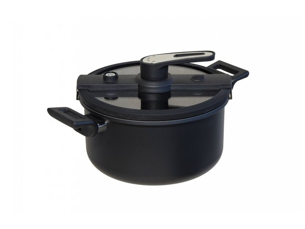 Nízkotlakový hrniec v sebe spája všetky dnes dostupné technológie a poznatky do jedného produktu so skvelým výkonom. Nízkotlakový hrniec umožňuje variť tradičným spôsobom pomocou ľahko zvýšeného tlaku efektívnejšie bez teplotných výkyvov a pomáha vám tak šetriť čas aj náklady na energie. Cez presklené veko môžete sledovať proces varenia a vďaka nízkemu tlaku tiež môžete kedykoľvek pridať korenie alebo ďalšie suroviny. Určenie hrnca: Typ: nízkotlaký hrniec Typ ohrevu: plyn, sklokeramika, elektrická platňa, indukcia Rozmery hrnca: Objem: 5,5 l Priemer hrnca: 24 cm Výška hrnca bez veka: 13 cm Hmotnosť: 2,1 kg Špeciálne vlastnosti nízkotlakového hrnca: Varenie čohokoľvek ako v bežnom hrnci ale s využitím zvýšeného tlaku Vytvára a udržuje rovnomerné stabilné teplo a pomáha tak zachovať viac chutí a vitamínov Hermeticky uzavreté veko umožňuje rýchle zahriatie a až o 48% rýchlejšiu prípravu pokrmu Priehľad vo veku z tvrdeného skla umožňuje sledovať a kontrolovať proces varenia Na rozdiel od tlakových hrncov umožňuje nízkotlakový hrniec kedykoľvek pridať korenie, ďalšie suroviny, alebo len pokrm ochutnať. Veko je možné vďaka špeciálnemu uzáveru pohodlne a bezpečne otvoriť kedykoľvek jednou rukou Silikónové tesnenie veka presne dolieha na okraj hrnca a zabraňuje unikaniu tekutín a pary 2 bezpečnostné ventily (jeden priebežný a druhý poistný) udržujú stály a bezpečný tlak po celú dobu varenia Nízkotlaký hrniec svojimi vlastnosťami výrazne šetrí spotrebované energie a váš čas Materiál a povrch hrnca: Materiál: zliatina hliníka Vnútorný povrch: nepriľnavý Vonkajší povrch: žiaruvzdorná farba Celkový počet vrstiev: 6 Ostatné vlastnosti: Vyrobené bez použitia PFOA a ťažkých kovov Zosilnený okraj zaisťujúci vysokú pevnosť tela hrnca Vhodný do umývačky riadu Možno uskladniť v chladničke Príslušenstvo: Špeciálne veko s tvrdeným sklom, silikónovým tesnením a 2 bezpečnostnými ventilmi Detailný popis vrstiev: 2 nepriľnavé vrstvy (BLACKON+, bez PFOA) 1 základná vrstva Telo hrnca (zliatina hliníka 4006 opracovaná pieskovaním zaisťujúcim až 2x dlhšiu životnosť) 1 žiaruvzdorná silikónová vrstva s prefarbením 1 indukčná vrstva z nerezovej ocele (magnetizovaná, AISI 430)