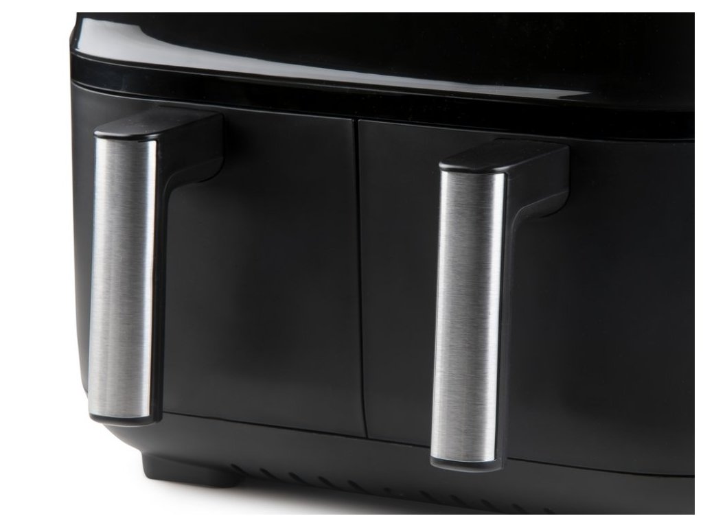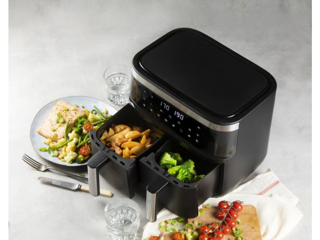 Kompaktná teplovzdušná fritéza s dvoma samostatnými fritovacími košmi s plne oddeleným ovládaním teploty a času. Jednoducho tak môžete pripraviť mäso a prílohu zvlášť a pri správnej teplote, alebo fritovať iba v jednom koši a ušetriť tak náklady na prípravu menšieho pokrmu. Základné parametre fritézy: Typ fritézy: dvojitá teplovzdušná fritéza Počet fritovacích košov: 2 Objem jedného fritovacieho koša: 4 l Hmotnosť surovín jedného koša: 1,2 kg Doba nahriatia na najvyššiu teplotu: 2 min Celkový príkon: 2850 W Usporiadanie prístroja a ovládacie prvky: 2 samostatné fritovacie koše v 2 plne oddelených vnútorných priestoroch Samostatné nastavenie teploty i času pre ľavú aj pravú stranu fritézy zvlášť LED panel zobrazujúci nastavenie, vybraný program a priebeh pečenia pre každú stranu zvlášť Dotykové ovládacie tlačidlá: Digitálny termostat: 80-200 °C Digitálny časovač až na 60 minút Tlačidlo pre rýchle nastavenie rovnakých hodnôt na oboch stranách Programy a funkcie: 8 automatických prednastavených programov alebo vlastné nastavenie Program na sušenie potravín s teplotou 40-80°C a časom 1-12 h Automatické prerušenie a pokračovanie programu pri vybratí, resp. zasunutie koša Automatické vypnutie a vyfúkanie horúceho vzduchu po skončení ohrevu Automatické vypnutie pri nečinnosti za 2 min Ostatné užitočné vlastnosti: Fritovacie koše s kvalitným nepriľnavým povrchom Vyberateľný podtácok na dne fritovacie koše prepúšťajúce výpok zo surovín na dno koša Bezpečnostná poistka proti prehriatiu Tepelne izolované rukoväte aj telo prístroja Integrované madlá po stranách pre ľahké a bezpečné prenášanie Rozmery prístroja a balenia: Vnútorné rozmery fritovacieho koša (š x h x v): 14,5 x 22 x 10,5 cm Dĺžka prívodného kábla: 76 cm Rozmery balenia (š x h x v): 39,3 x 39 x 36 cm Hmotnosť balenia: 8,3 kg Rozmery prístroja (š x h x v): 35,7 x 41 x 31,2 cm Hmotnosť prístroja: 6,8 kg Výhody fritovania a pečenia v teplovzdušnej fritéze: Nie je potrebný takmer žiadny pridaný tuk na vyprážanie Veľmi rýchle nahriatie na maximálnu teplotu do 2 minút od zapnutia Efektívna cirkulácia vzduchu zaručuje dokonalé a rýchle výsledky pečenia Multifunkčné využitie: čerstvé aj mrazené hranolky, kuracie nugety aj čerstvá ryba, huby, koláče, muffiny i chlieb a ďalšie