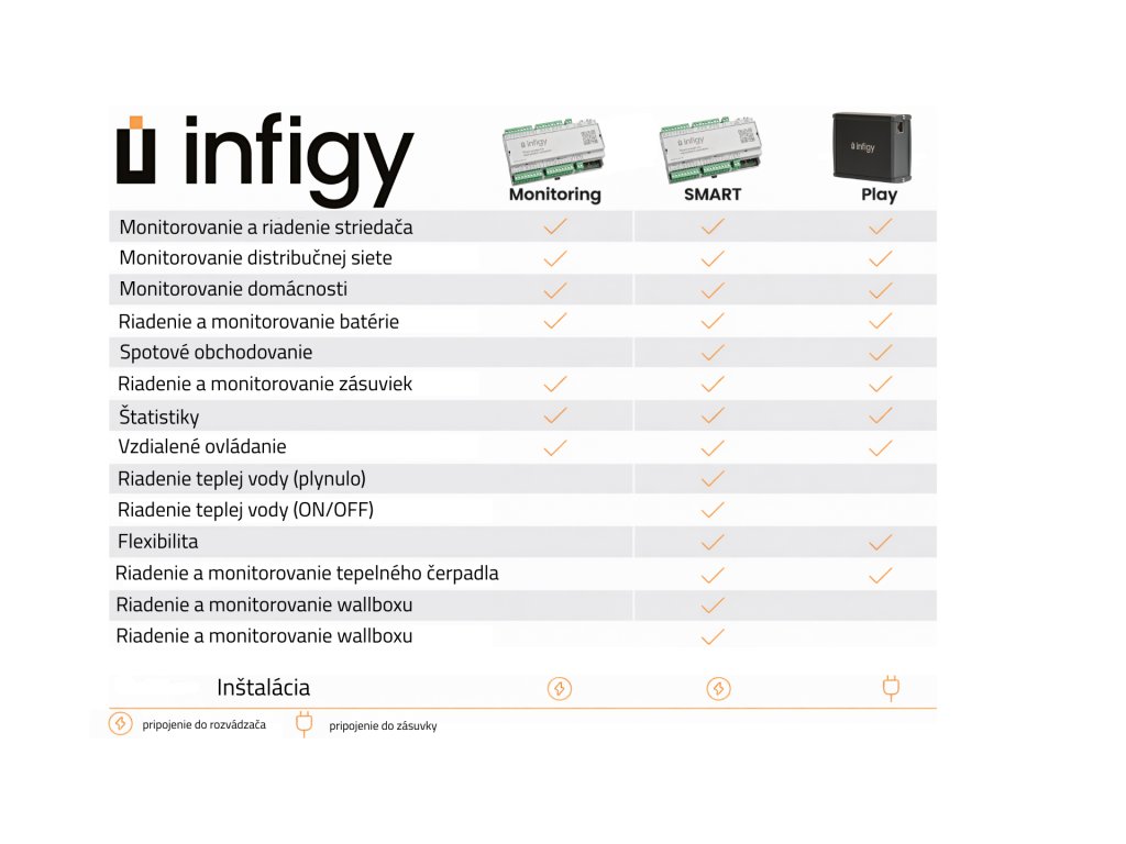 Systém je možné prepojiť s vybranými dodávateľmi a využívať výhodné spotové tarify bez ručného nastavovania. Infigy prepája a koordinuje fotovoltaiku, batériové úložisko, ohrev vody, tepelné čerpadlo, wallbox a vybrané spotrebiče. Výsledkom je automatizovaný energetický manažment, ktorý šetrí náklady, rozhoduje sám a zvyšuje komfort bývania – s prehľadnou mobilnou aplikáciou vždy po ruke.