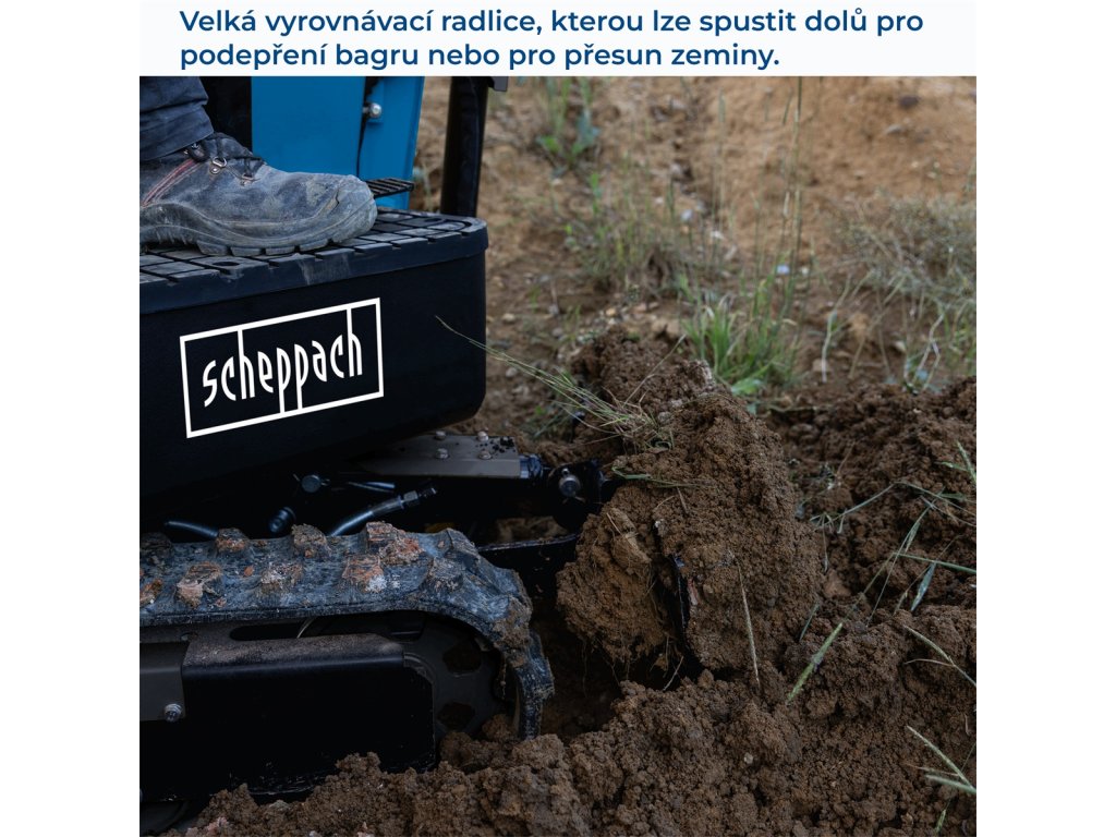 Gumový pásový podvozok so šírkou pásov 150 mm poskytuje stabilitu, nezávislé ovládanie a maximálnu rýchlosť 1,7 km/h, pričom zvládne stúpanie až 15°. Súčasťou výbavy je aj nivelačná radlica pre stabilizáciu stroja alebo presun zeminy. Elektrický štartér, parkovacia brzda s hydraulickým zámkom a výkonné LED osvetlenie na ramene zvyšujú bezpečnosť a komfort obsluhy.