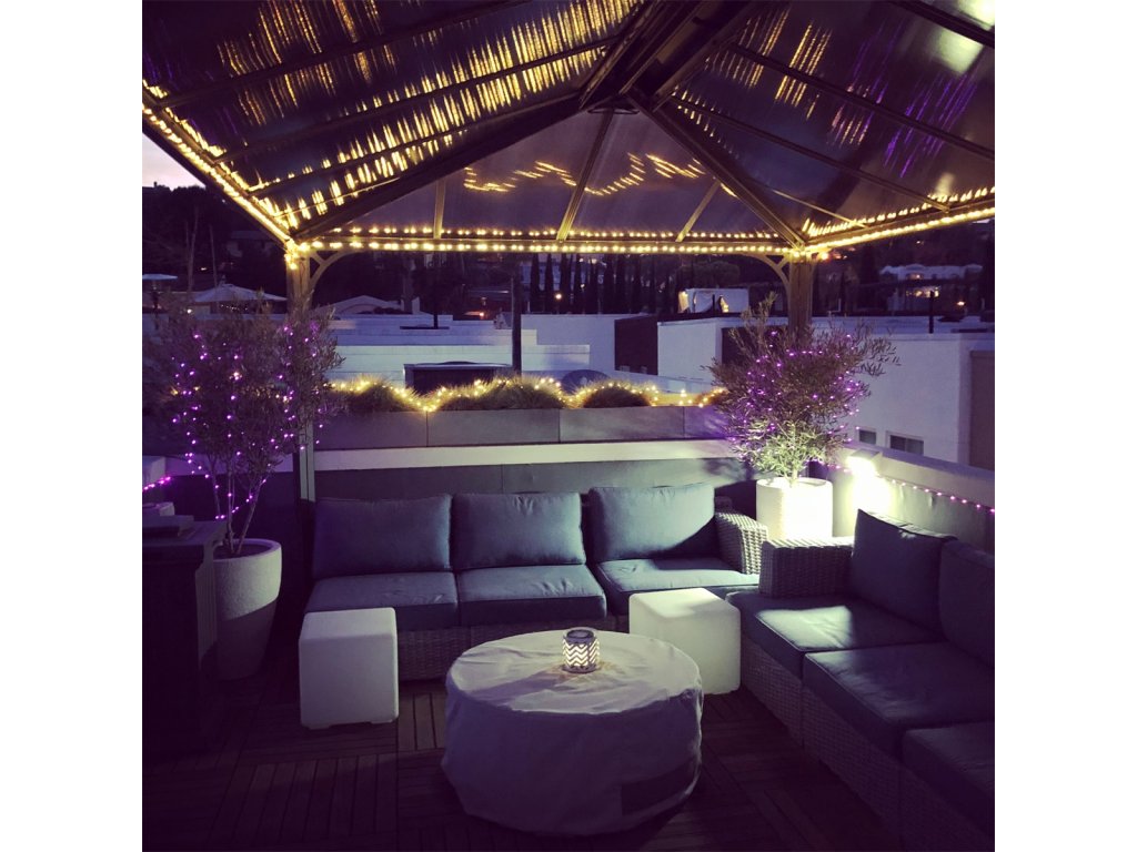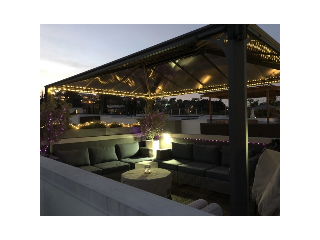 Praktický integrovaný systém okapov s priemerom Ø 40 mm zabezpečuje efektívny odvod dažďovej vody. Ventilačný otvor podporuje prirodzené prúdenie vzduchu a pomáha odvádzať dym pri grilovaní. Súčasťou je aj systém posuvných háčikov, ktorý umožňuje jednoduché zavesenie závesov alebo siete proti hmyzu.