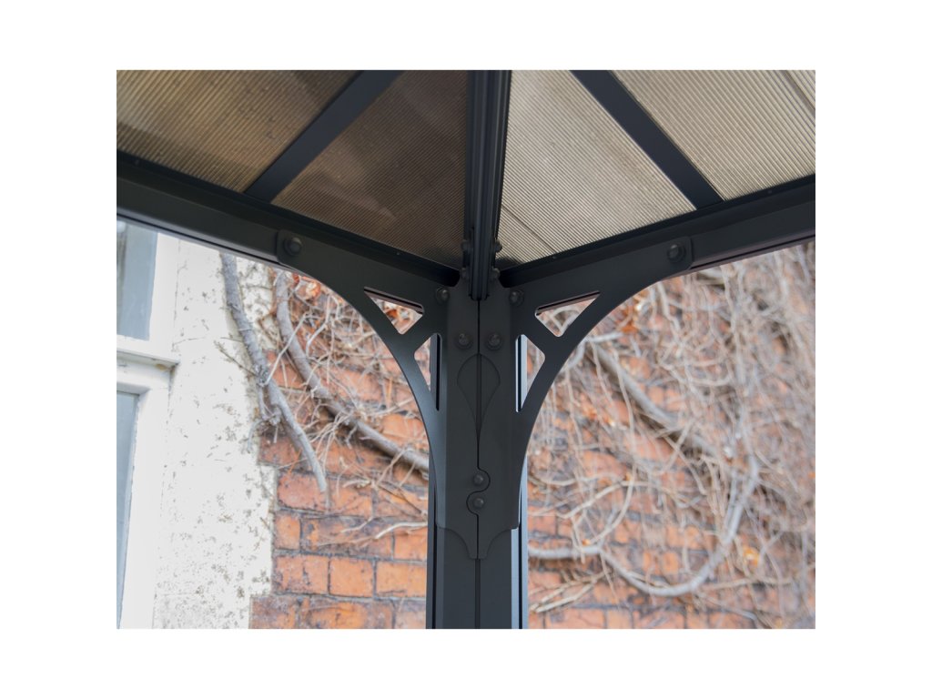 Strechu tvoria prakticky nezničiteľné panely z dvojkomôrkového polykarbonátu s hrúbkou 6 mm, ktoré poskytujú spoľahlivú ochranu pred dažďom, krúpami, snehom a zároveň účinne filtrujú škodlivé UV žiarenie. Sivý odtieň panelov prepúšťa dostatok denného svetla počas zamračených dní a zároveň vytvára príjemný tieň pri slnečnom počasí.