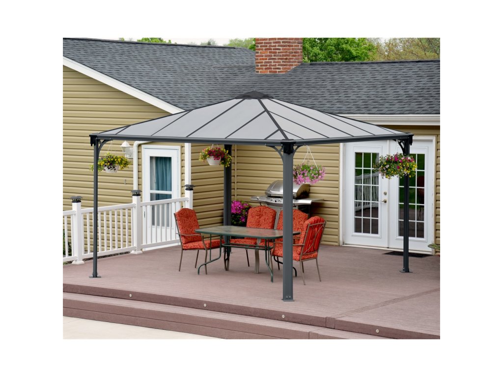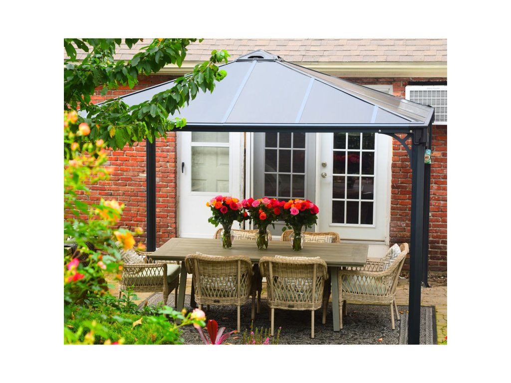 Konštrukcia altánu je navrhnutá ako takmer nezničiteľná. Tvorí ju pevný rám z hliníkových profilov v kombinácii s 6 mm dvojkomôrkovým polykarbonátom, ktorý je odolný voči vetru, snehu aj krúpam. Strecha v elegantnom sivom odtieni spolu s antracitovou farbou rámu dokonale zapadne do moderného aj prírodného prostredia záhrady.